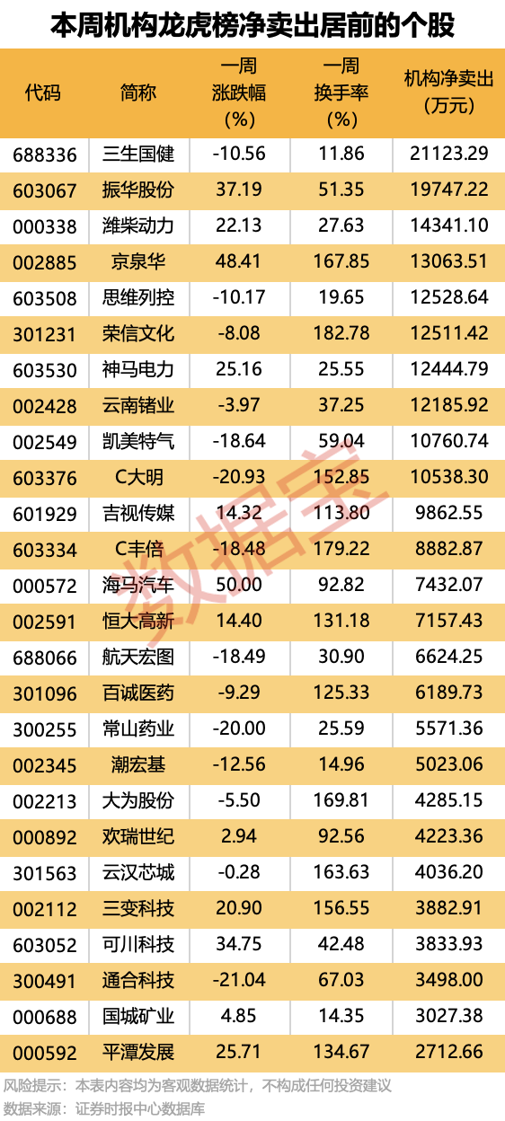 一周机构累计净卖出的个股中,10股金额均超1亿元,其中净卖出金额最多的是三生国健,达2.11亿元。该股本周累计下跌10.56%,周换手率为11.86%,因连续3个交易日内日收盘价格涨幅偏离值累计达33.59%等1次上榜龙虎榜,买卖居前营业部中机构合计净卖出2.11亿元;同时上榜的还有沪股通专用席位,净买入1501.68万元,营业部席位一周合计净买入6423.58万元。