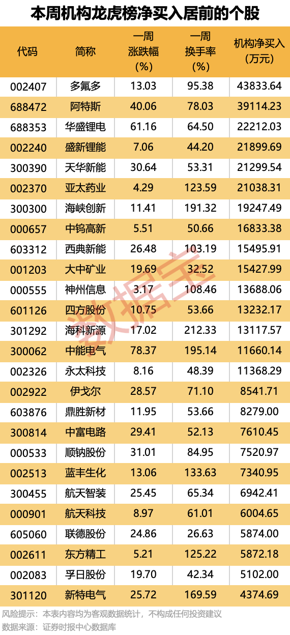 龙虎榜数据显示,本周机构专用席位共现身133股龙虎榜,净买入65股,净卖出68股。其中,52股获机构净买入均超千万元,多氟多、阿特斯等15股机构净买入金额均超1亿元。