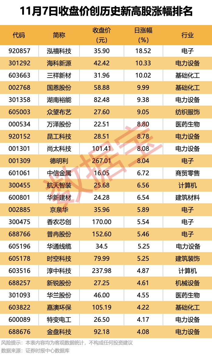 收盘价创历史新高股中,今日股价平均上涨4.98%,涨停的有三祥新材、国恩股份等,涨幅居前的有泓禧科技、海科新源、湖南裕能等。