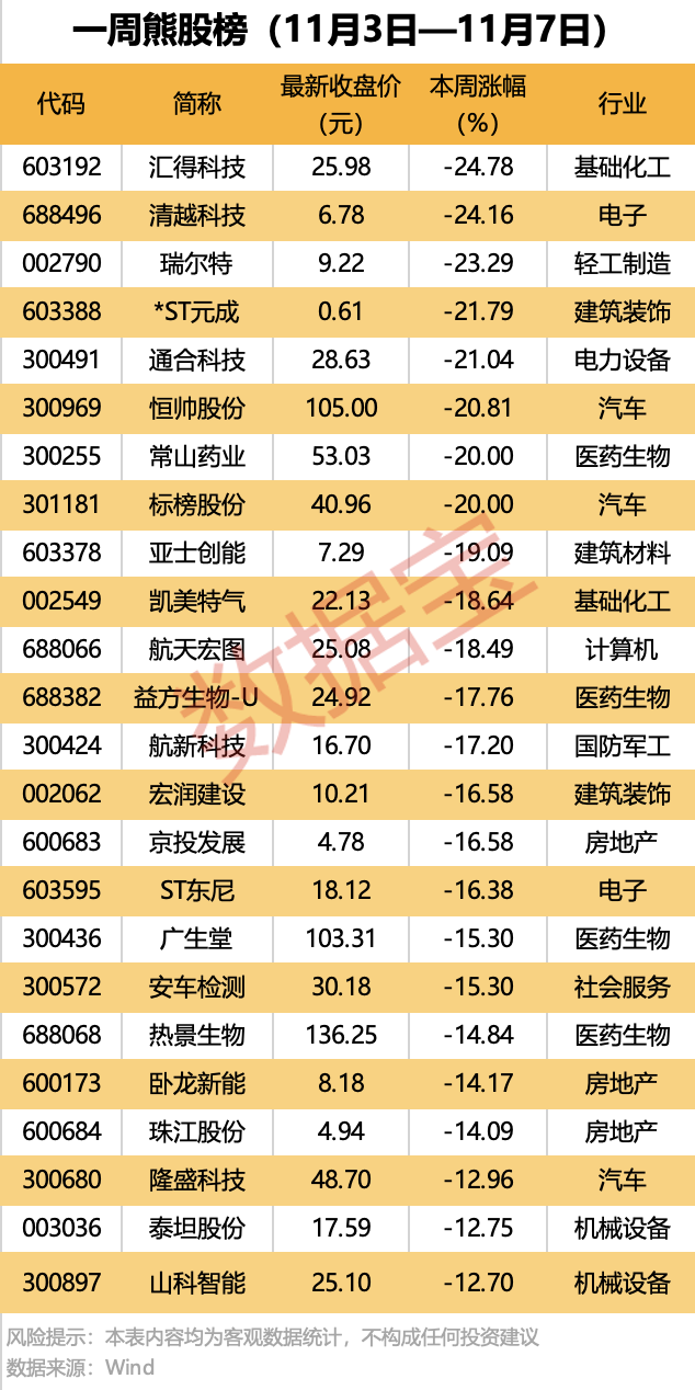 本周累计下跌的个股中,73股跌幅在10%以上,汇得科技、清越科技(维权)、瑞尔特和*ST元成(维权)等8股累计跌幅均在20%及以上。