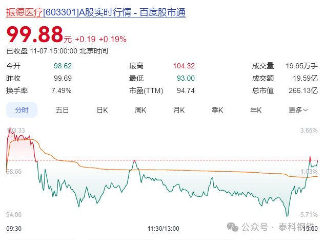 2025年11月7日开盘后,上市公司振德医疗一度涨至104.32元的高点,收盘价99.88元。