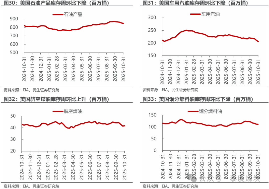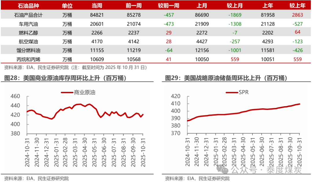 美国原油库存上升,汽油库存下降。截至10月31日,1)原油方面,美国战略原油储备40960万桶,周环比+50万桶;商业原油库存42117万桶,周环比+520万桶。2)成品油方面,车用汽油/航空煤油/馏分燃料油库存分别为20601/4170/11155万桶,周环比-473/+28/-64万桶。