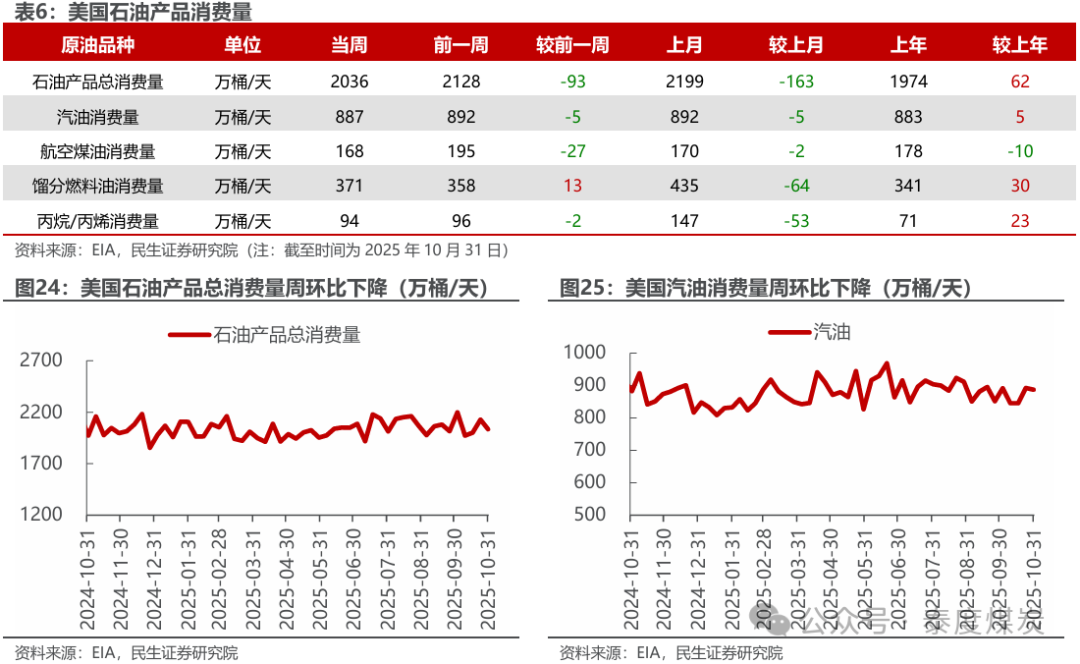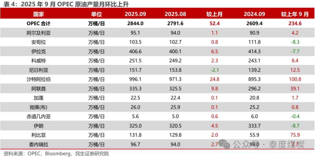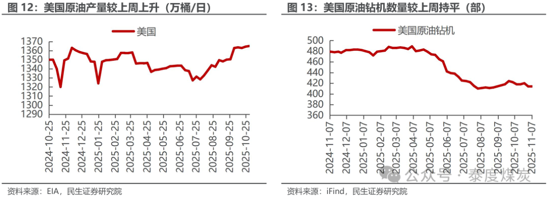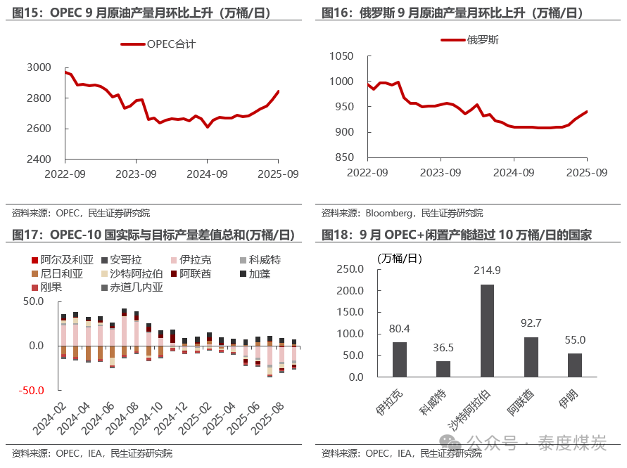 OPEC+暂停26Q1增产,美国制裁影响仍需观察。基本面方面,11月2日,OPEC+主产八国宣布12月将进一步增产13.7万桶/日,同时由于季节性因素暂停2026年1至3月的增产,下一次八国会议将于11月30日举行。从OPEC+大幅提产后的生产情况来看,其计划5-7月分别增产41.1万桶/日,对应实际产量增长12.7、53.7、26.5万桶/日,合计92.9万桶/日;8-9月分别计划增产54.8、54.7万桶/日,对应实际产量增长49.8、58.6万桶/日,合计108.4万桶/日,因此,OPEC+整体增产的执行力度较好,补偿性减产的执行力度较差。地缘方面,美国对俄两大石油生产商实施制裁后,土耳其炼油商也开始削减俄罗斯原油采购,转而向伊拉克、利比亚、沙特及哈萨克斯坦等国寻求额外油源,目前美国对俄制裁影响仍需持续观察。由于OPEC+于26Q1暂停增产超市场预期,叠加美国对俄罗斯的制裁影响,当前市场悲观情绪好转,但对需求较弱、供应过剩的情绪仍在,因此,我们预计油价短期依然以震荡为主线。