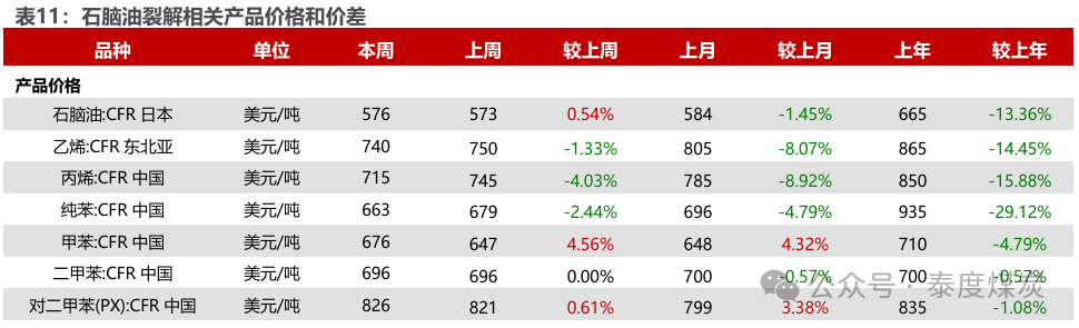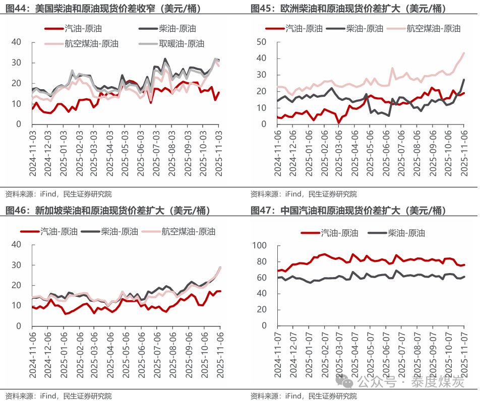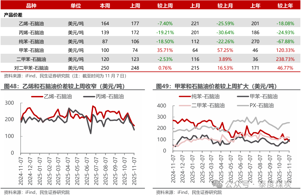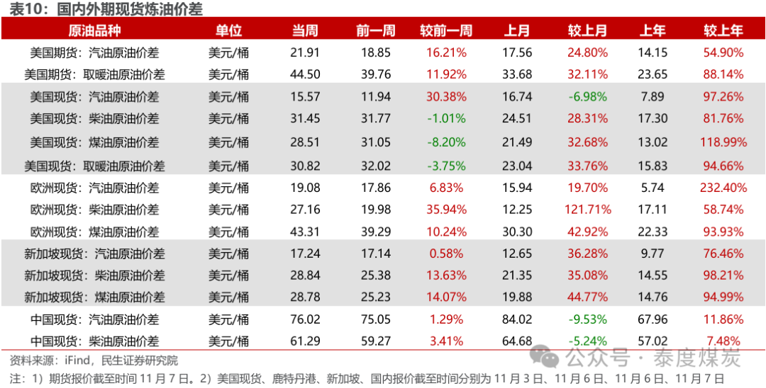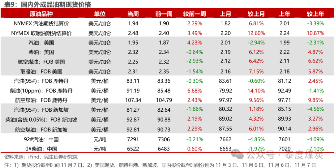 据iFind数据,截至2025年11月7日,国内汽柴油现货价格为7291、6522元/吨,周环比变化-0.21%、+0.60%;和布伦特原油现货价差为76.02、61.29美元/桶,周环比变化+1.29%、+3.41%。