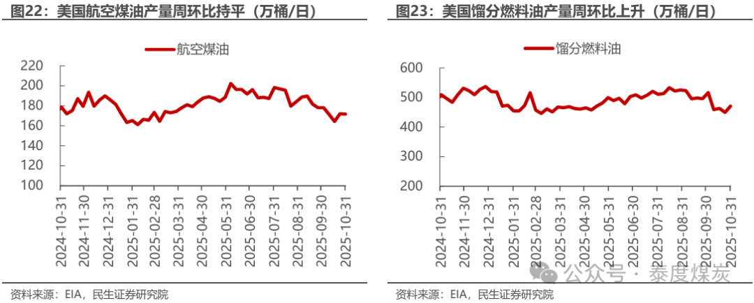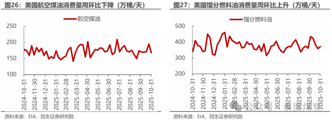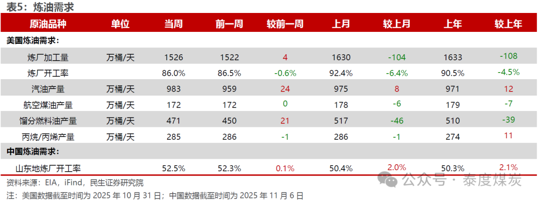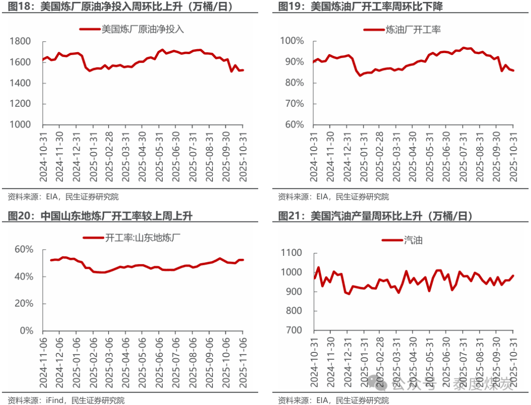 美国原油产量上升,炼油厂日加工量上升。截至10月31日,1)原油方面,美国原油产量1365万桶/日,周环比+1万桶/日。2)成品油方面,美国炼油厂日加工量1526万桶/日,周环比+4万桶/日;炼厂开工率86.0%,周环比-0.6pct;汽油/航空煤油/馏分燃料油产量分别为983/172/471万桶/日,周环比+24/0/+21万桶/日。