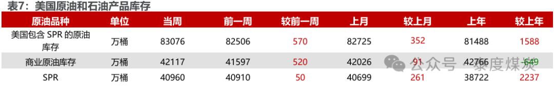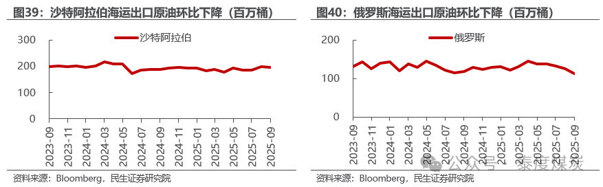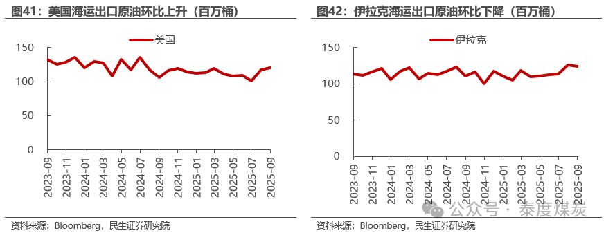 2)海运出口:沙特196百万桶,同比上升4.7%,环比下降2.0%;俄罗斯113百万桶,同比下降4.2%,环比下降9.3%;美国121百万桶,同比上升13.5%,环比上升3.2%;伊拉克125百万桶,同比上升12.7%,环比下降1.1%。