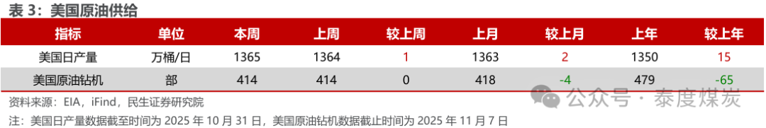 11月3日,金十数据报道,欧佩克秘书处周日宣布,已收到俄罗斯、伊拉克、阿联酋、哈萨克斯坦和阿曼的最新补偿计划,以弥补超过目标的产量,时间表涵盖了从上个月到2026年6月的这段时间。10月27日,金十数据报道,美国至10月24日当周石油钻井总数420口,前值418口;天然气钻井总数 121口,前值121口。