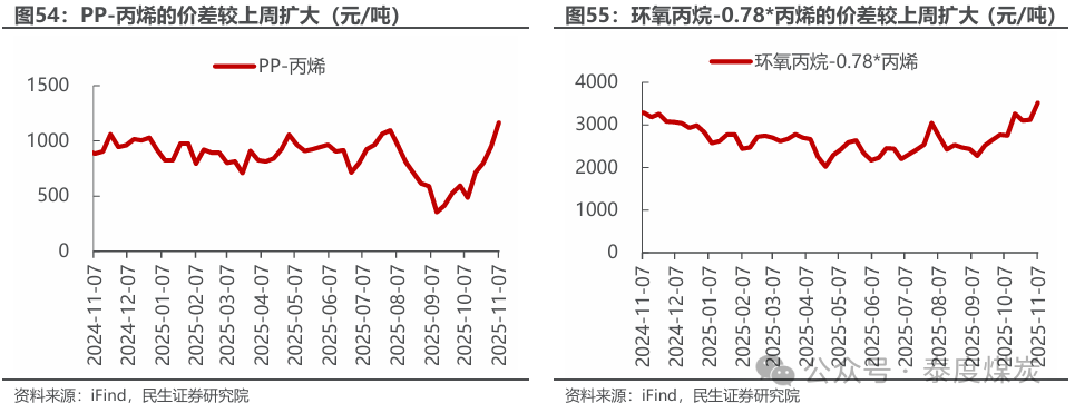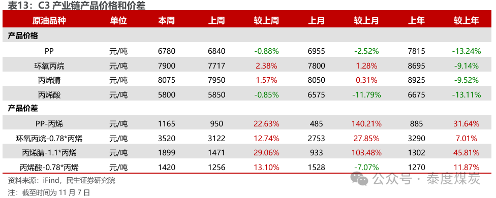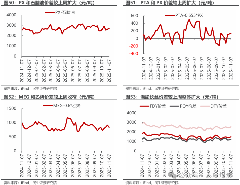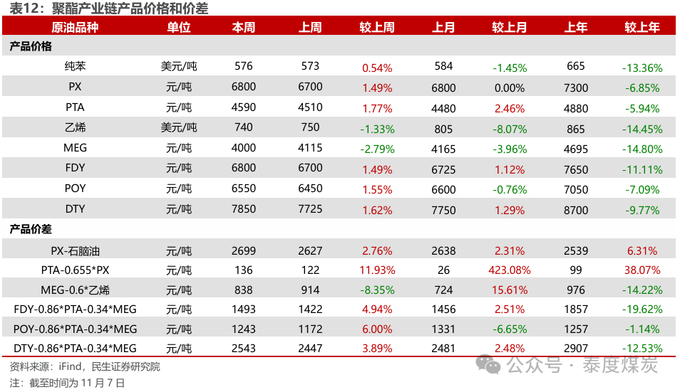汽油价差扩大,涤纶长丝价差扩大。截至11月7日,1)炼油板块,NYMEX汽油和取暖油期货结算价为1.94/2.48美元/加仑,周环比变化+2.29%/+3.49%,和WTI期货结算价差为21.91/44.50美元/桶,周环比变化+16.21%/+11.92%。2)化工板块,乙烯/丙烯/甲苯和石脑油价差分别为164/139/100美元/吨,较上周变化-7.40%/-19.21%/+35.71%;FDY/POY/DTY价差为1493/1243/2543元/吨,较上周变化+4.94%/+6.00%/+3.89%。