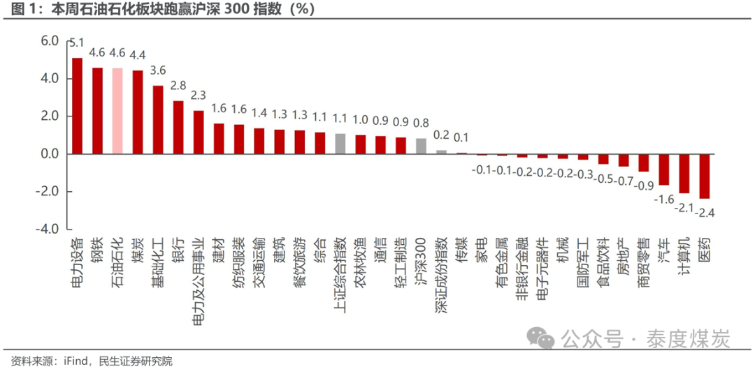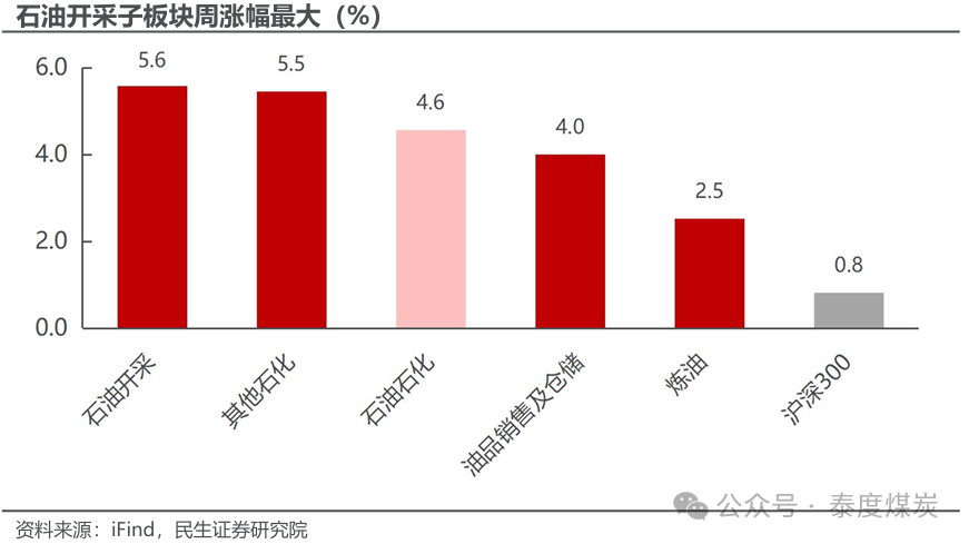 截至11月7日,本周沪深300上涨0.8%,中信石油石化板块上涨4.6%。各子板块中,石油开采子板块周涨幅最大,为5.6%;炼油子板块周涨幅最小,为2.5%。