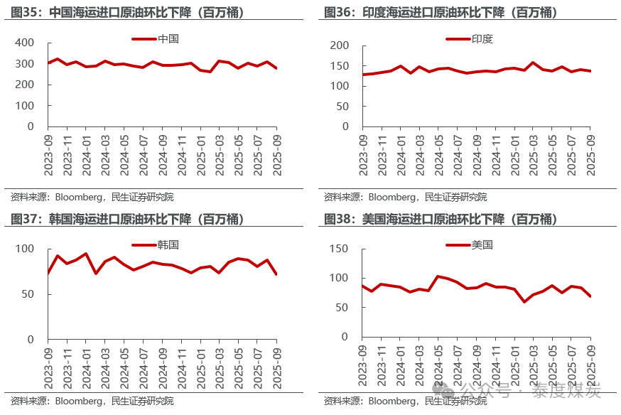 1)海运进口:中国277百万桶,同比下降5.4%,环比下降10.3%;印度137百万桶,同比上升1.1%,环比下降2.8%;韩国72百万桶,同比下降13.4%,环比下降18.5%;美国69百万桶,同比下降17.6%,环比下降17.6%。