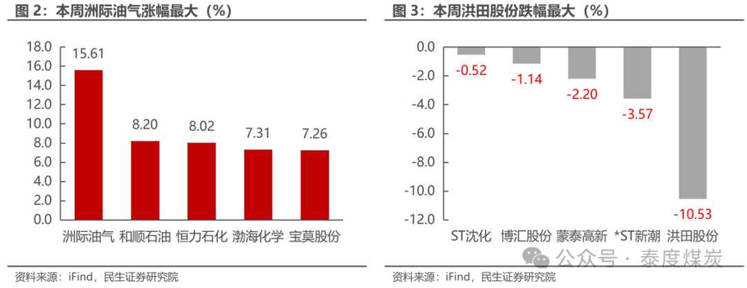 本周洲际油气涨幅最大。截至11月7日,石油石化行业中,公司周涨跌幅前5位分别为:洲际油气上涨15.61%,和顺石油上涨8.20%,恒力石化上涨8.02%,渤海化学上涨7.31%,宝莫股份上涨7.26%。
