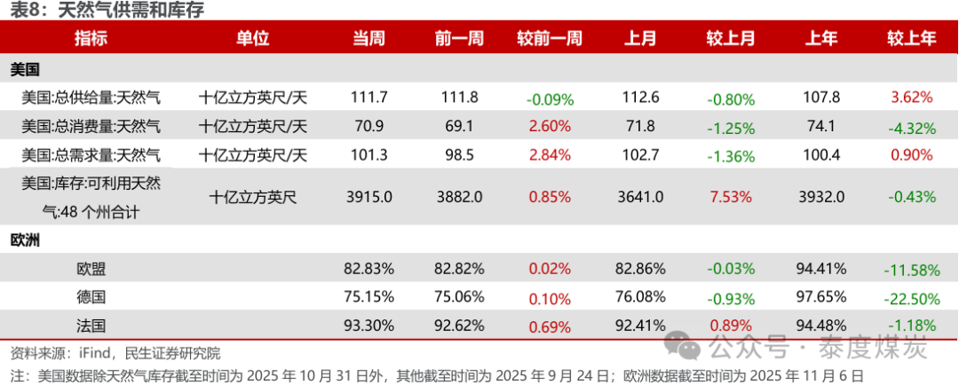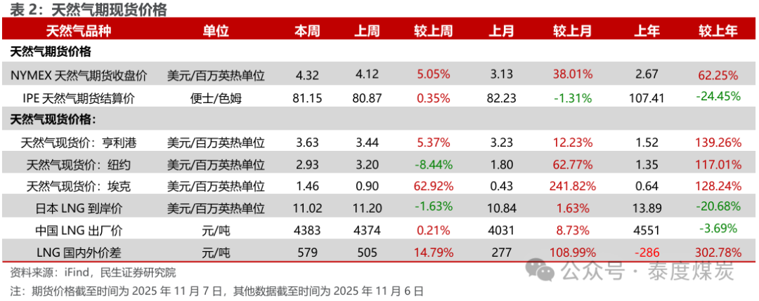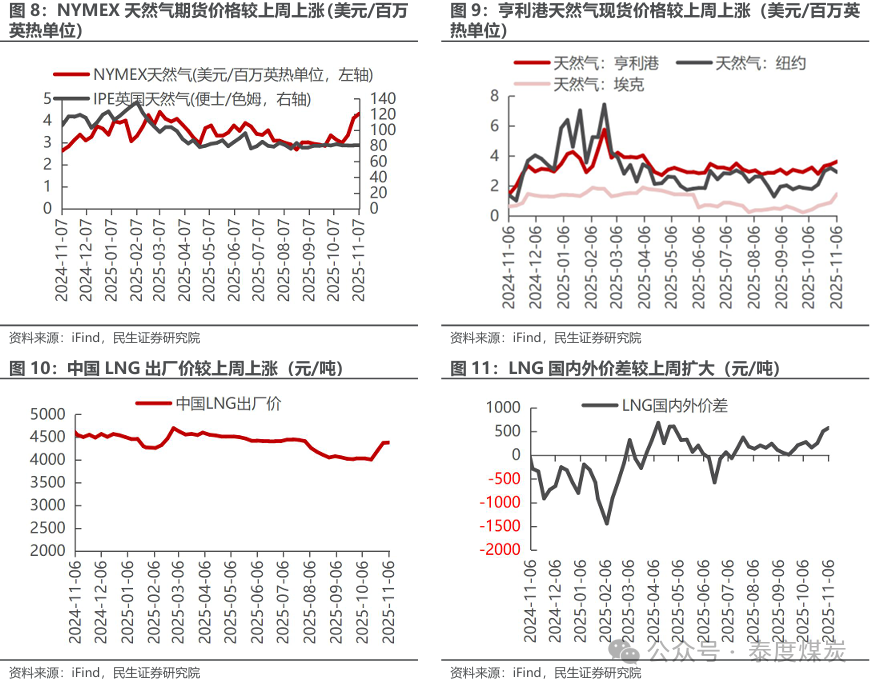 截至2025年11月7日,NYMEX天然气期货收盘价为4.32美元/百万英热单位,较上周上涨5.05%;截至11月6日,日本LNG到岸价格11.02美元/百万英热单位,较上周下跌1.63%;中国LNG出厂价为4383元/吨,较上周上涨0.21%。
