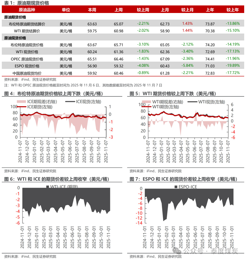 据iFind数据,截至2025年11月7日,布伦特原油期货结算价为63.63美元/桶,较上周下跌2.21%;WTI期货结算价59.75美元/桶,较上周下跌2.02%。