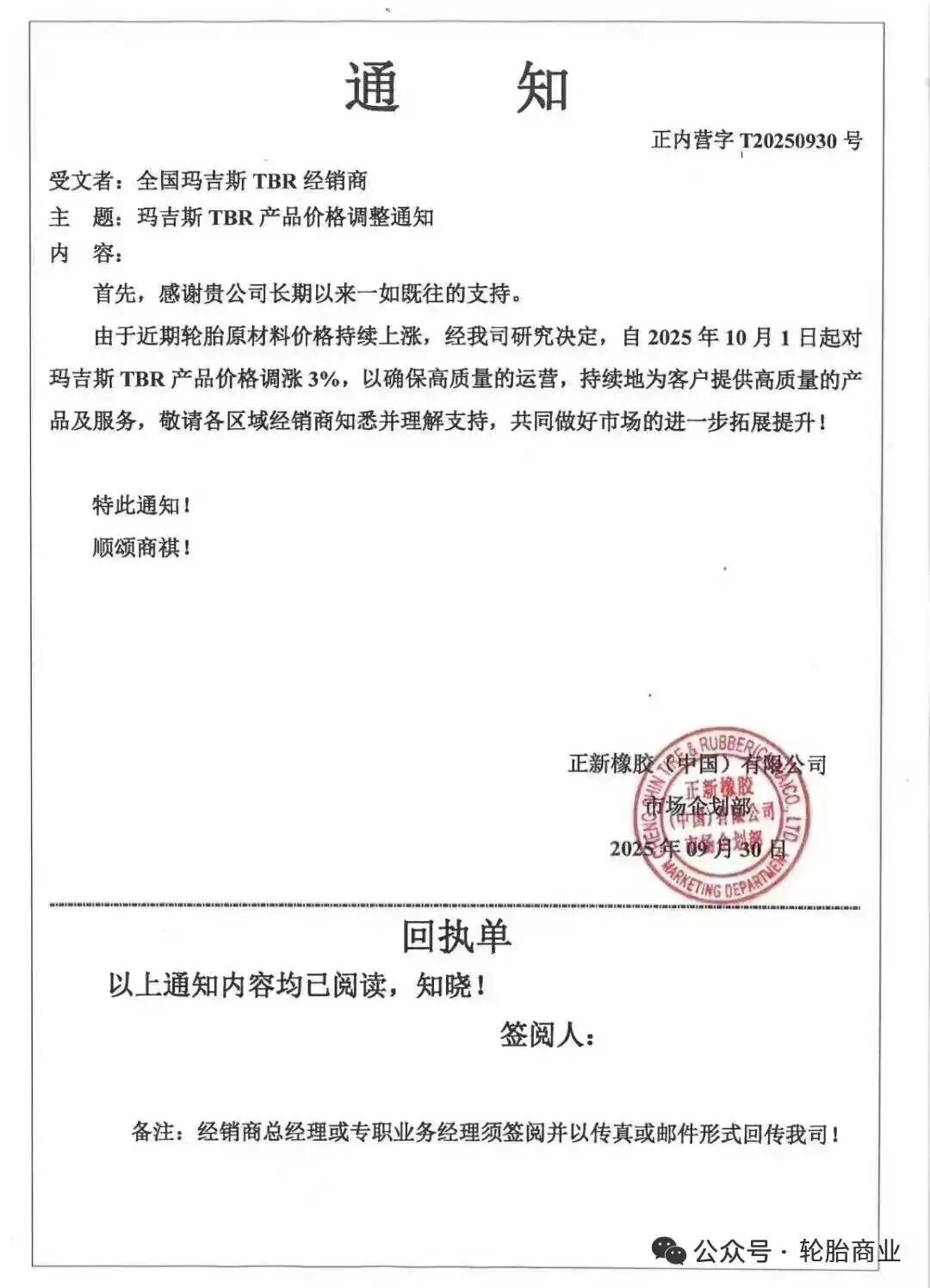 玛吉斯轮胎发布关于TBR产品价格调整的通知,通知表示,由于近期轮胎原材料价格持续上涨,经公司研究决定,自2025年10月1日起,对玛吉斯TBR轮胎产品价格上涨3%。