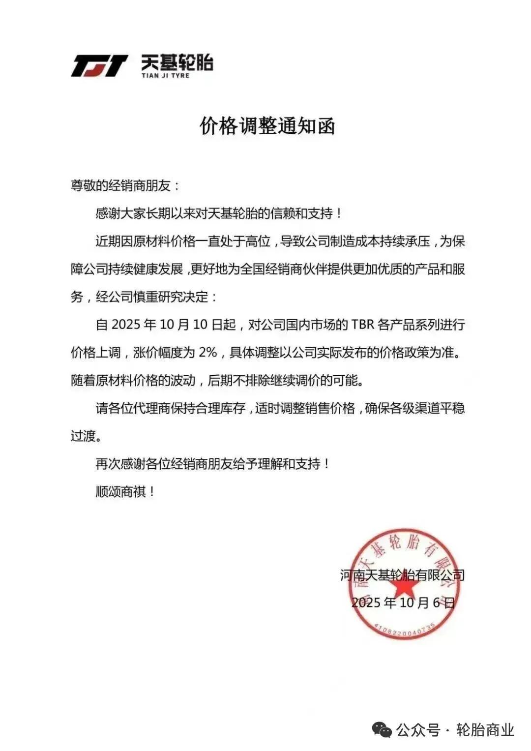 河南天基轮胎有限公司发布涨价通知表示,经公司慎重研究决定自 2025 年 10 月 10 日起,对公司国内市场的 TBR 各产品系列进行价格上调,涨价幅度为 2%,具体调整以公司实际发布的价格政策为准随着原材料价格的波动,后期不排除继续调价的可能。