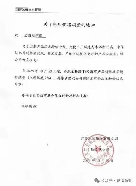 2025年10月15日,江苏三元轮胎有限公司于宣布,因产品品质升级导致制造成本上升,自10月20日起对旗下TBR(全钢子午线轮胎)所有产品价格上调2%。
