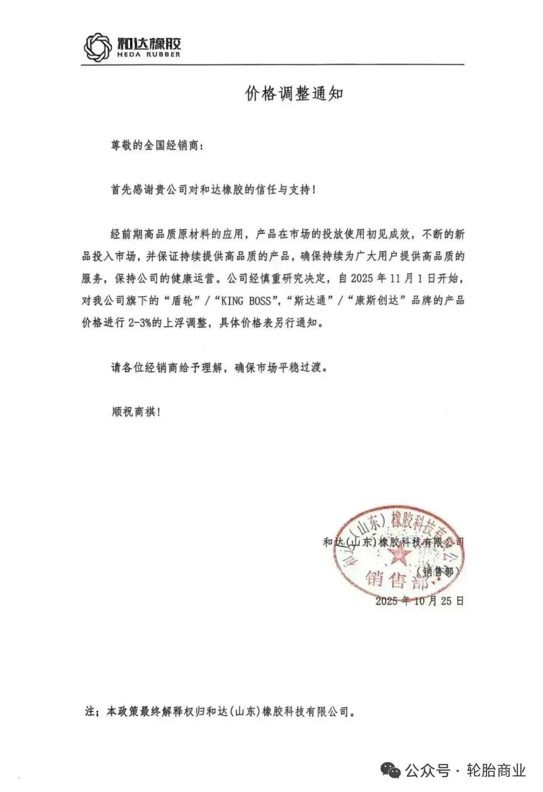 2025年10月25日,又有轮胎企业发布涨价通知,和达橡胶科技有限公司表示,自2025年11月1日开始,对公司旗下“盾轮”/“KING BOSS”,“斯达通”/“康斯创达”品牌的产品价格进行2-3%的上浮调整,具体价格表另行通知。