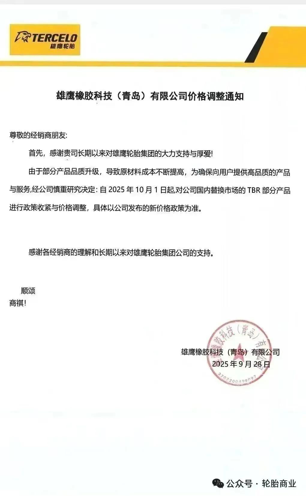 雄鹰橡胶科技(青岛)有限公司发布价格调整通知表示,自2025年10月1日起,对国内替换市场TBR部分产品进行政策收紧与价格调整。