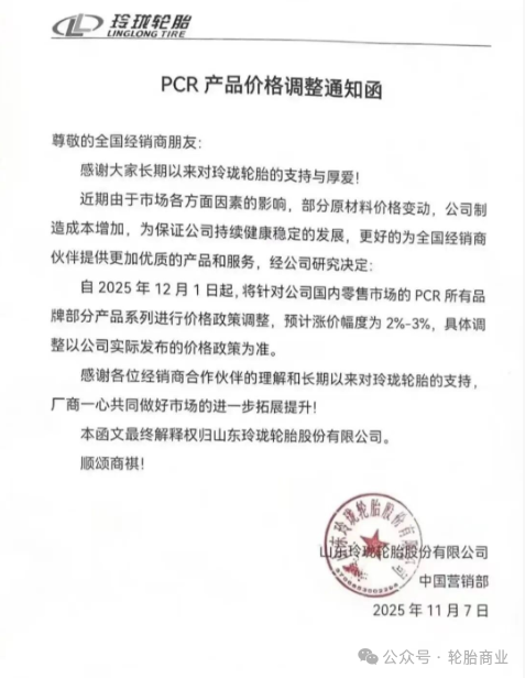 2025年11月7日,山东玲珑轮胎股份有限公司发布PCR产品价格调整通知函,自2025年12月1日起,对公司国内零售市场的PCR所有品牌部分产品系列进行价格政策调整,涨价幅度2%-3%。