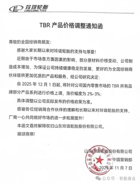 2025年11月7日,山东玲珑轮胎股份有限公司发布TBR产品价格调整通知函,自2025年12月1日起,对公司国内零售市场的TBR所有品牌部分产品系列进行价格政策调整,涨价幅度2%-3%。