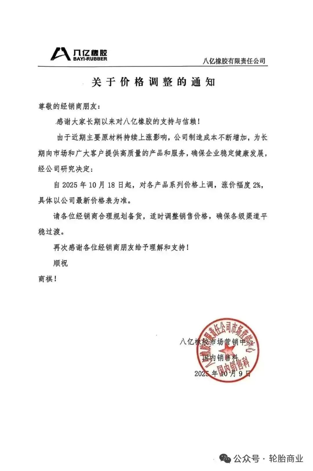 八亿橡胶发布关于价格调整的通知表示,由于近期主要原材料持续上涨影响,公司制造成本不断增加,自2025年10月18日起,对各产品系列价格上调,涨价幅度2%。
