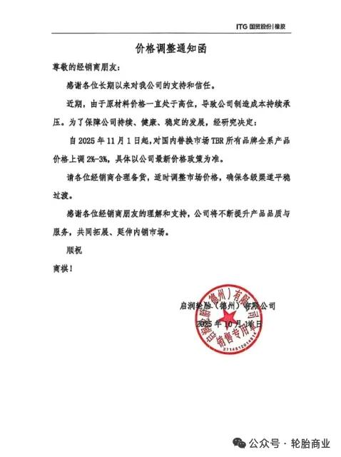 2025年10月14日,启润轮胎(德州)有限公司发布价格调整通知函。函中指出,由于原材料价格持续高位运行,公司制造成本承压,为保障健康稳定发展,决定自2025年11月1日起,对国内替换市场TBR所有品牌全系产品价格上调2%-3%。公司已通知经销商合理备货,以确保市场平稳过渡,并承诺将持续提升产品品质与服务。