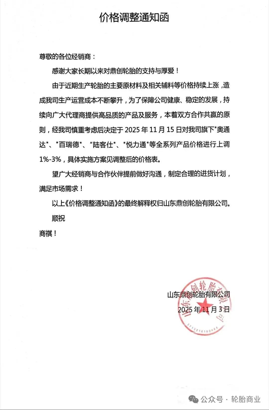 2025年11月3日,山东鼎创轮胎有限公司发布价格调整通知函,涨价通知表示,由于近期生产轮胎的主要原材料及相关辅料价格上涨,造成公司生产运营成本攀升,为保障公司稳定发展,公司决定于2025年11月15日对公司旗下"奥通达"、"百瑞德"、“陆客仕"、"悦力通"等全系列产品价格进行上调1%-3%,具体实施方案见调整后的价格表。