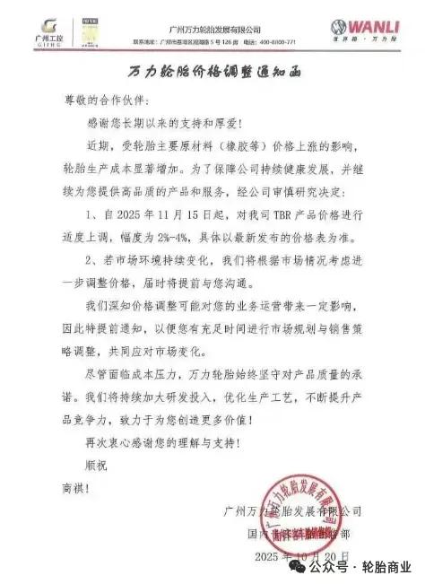 万力轮胎发布价格调整通知,公司决定自2025年11月15日起对公司TBR产品价格进行上调,涨幅2%-4%。
