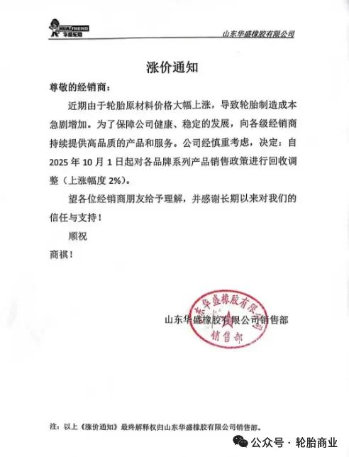 山东华盛橡胶有限公司发布涨价通知,自2025年10月1日起对各品牌系列产品销售政策回调,上涨幅度2%。