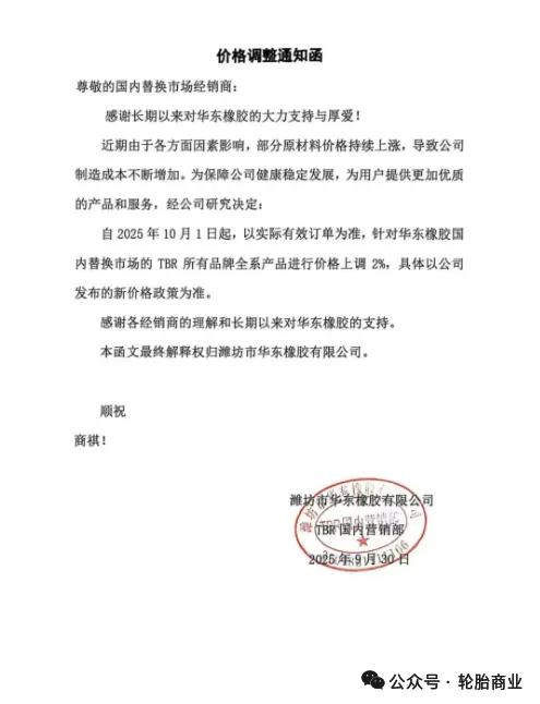 潍坊市华东橡胶有限公司发布价格调整通知表示公司决定自2025年10月1日起,针对华东橡胶国内替换市场TBR所有品牌全系产品价格上调2%。