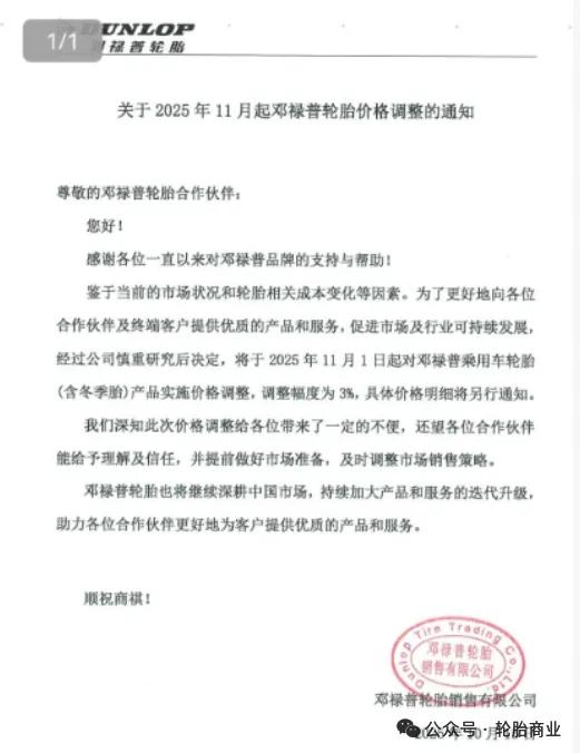 2025年10月15日,邓禄普宣布:自2025年11月1日起,对乘用车轮胎(含冬季胎)产品价格上调3%。