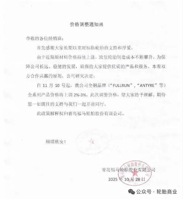 2025年10月28日,青岛福马轮胎股份有限公司发布价格调整通知函。涨价通知表示,由于近期原材料价格持续上涨,导致轮胎制造成本不断攀升。为保障公司的长远稳健发展,并确保能持续提供优质产品和服务,公司经研究决定,自2025年11月10日起,对其旗下“FULLRUN”、“ANTYRE”等全钢品牌的全系列产品价格上调2%至3%。