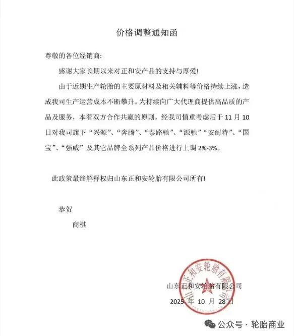 2025年10月28日山东正和安轮胎有限公司发布价格调整通知表示,因近期轮胎生产所需的主要原材料及辅料价格持续上涨,公司生产运营成本面临显著压力。为确保能够持续向代理商提供高品质的产品与服务,并基于合作共赢的原则,公司决定自2025年11月10日起,对旗下“兴源”、“奔腾”、“泰路驰”、“源驰”、“安耐特”、“国宝”、“强威”及其他品牌的全部系列产品价格上调2%至3%。该政策的最终解释权归山东正和安轮胎有限公司所有。