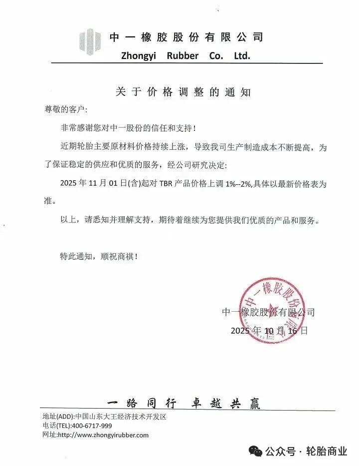 2025年10月16日,中一橡胶股份有限公司发布关于价格调整的通知表示,由于近期轮胎主要原材料价格持续上涨,导致公司生产制造成本不断提高,为保证供货稳定,公司决定自2025年11月1日起对TBR产品价格上调1%-2%。