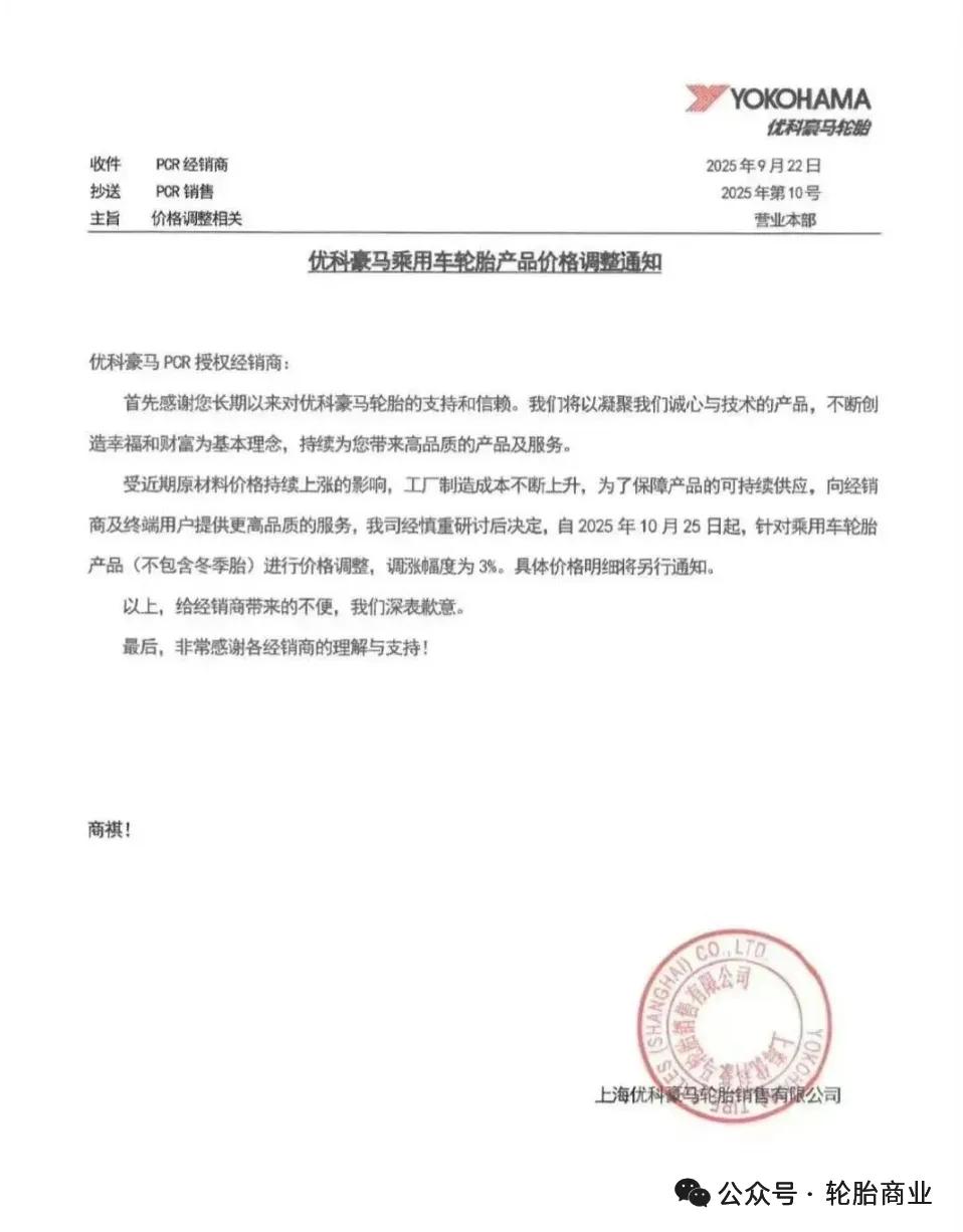 上海优科豪马轮胎销售有限公司发布乘用车轮胎产品价格调整通知表示,自2025年10月25日起,针对乘用车轮胎产品(不含冬季胎)进行价格调整,调涨幅度为3%。