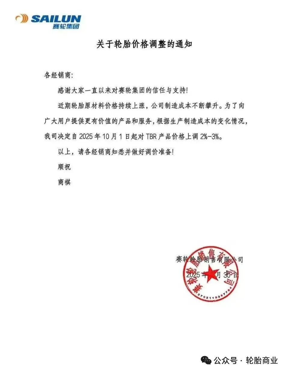 赛轮轮胎销售有限公司发布关于轮胎价格调整的通知表示,自2025年10月1日起对TBR产品价格上调2%-3%。