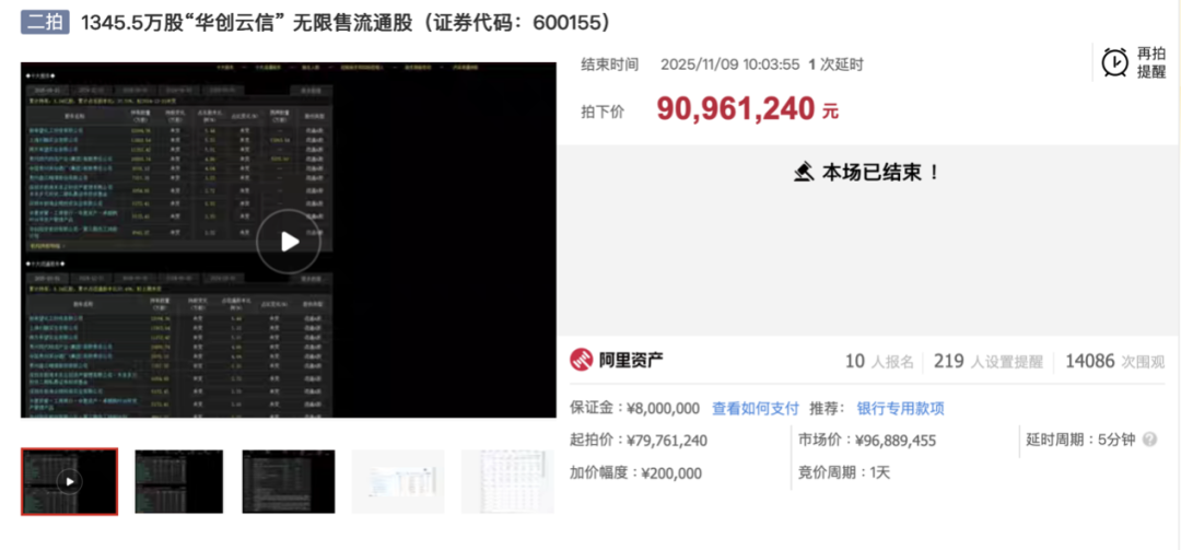 2025年11月9日,华创云信(600155)股东上海杉融实业有限公司持有的4145.5万股无限售流通股在淘宝网司法拍卖平台完成二次拍卖。