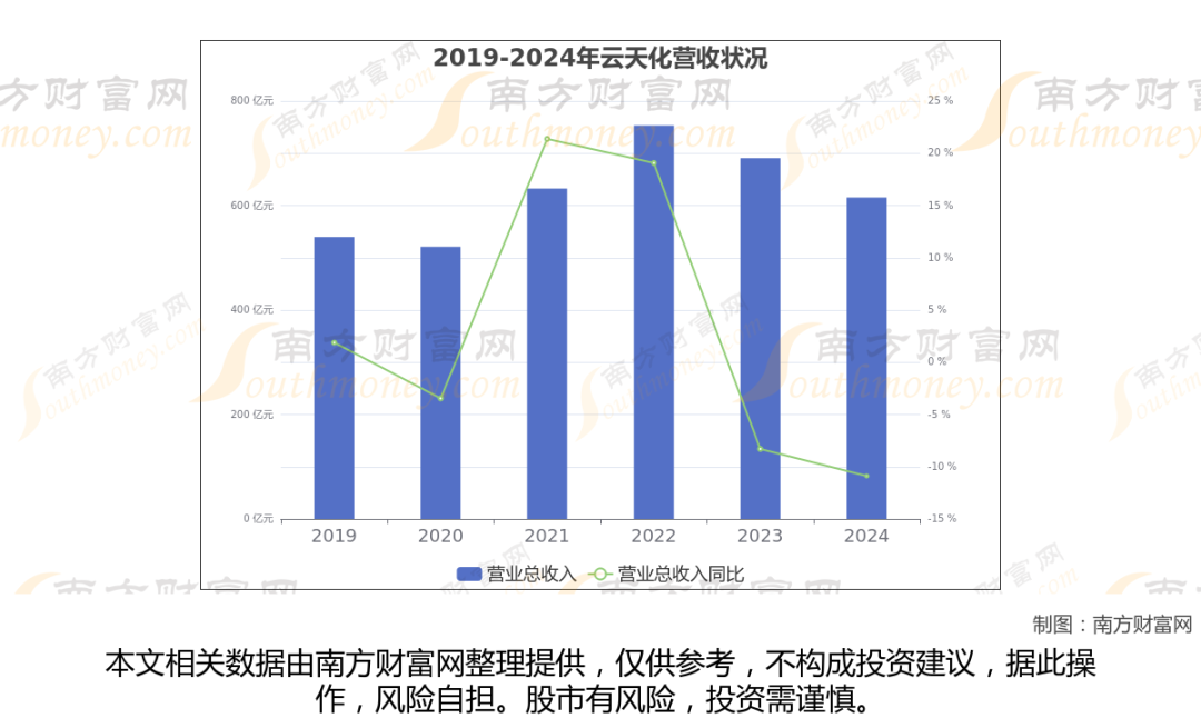(如上图)2024年云天化公司营业总收入为615.37亿,同比增长-10.89%,近5年复合增长率为4.24%。