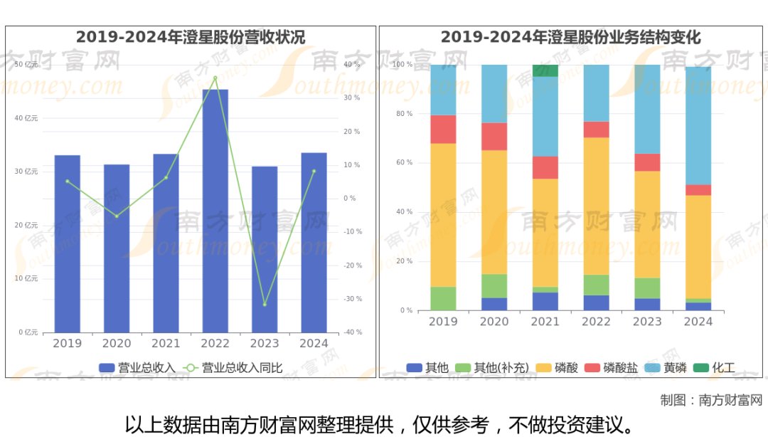 数据显示(如上图),澄星股份公司2024年营业收入33.56亿,同比增长8.22%,近5年复合年增长率(CAGR)1.7%。