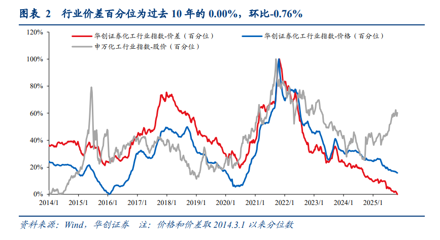从多项指标来看,化工行业已处于历史性的底部区域。华创证券数据显示,化工行业的整体加权开工率处于历史高点,但价差仍在“绝对底部”。该机构分析师认为,尽管距离全面反转仍需库存去化,但已有零星品种率先走出底部反转趋势。