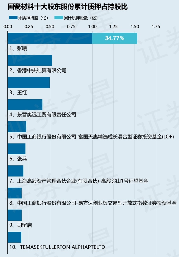 截止本公告日,股东张曦已累计质押股份5319.0万股,占其持股总数的34.77%。本次质押后国瓷材料十大股东的累计质押股份占持股比例(占持股比例的计算以公司最新一期财务报表公布的十大股东的持股总数为基准)见下图: