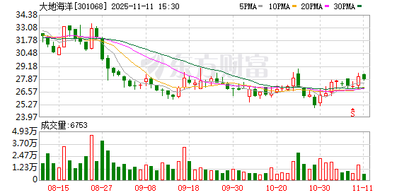 证券时报·数据宝统计,截至发稿,大地海洋收盘价为27.83元,下跌1.03%,本期筹码集中以来股价累计上涨5.66%。具体到各交易日,4次上涨,3次下跌。