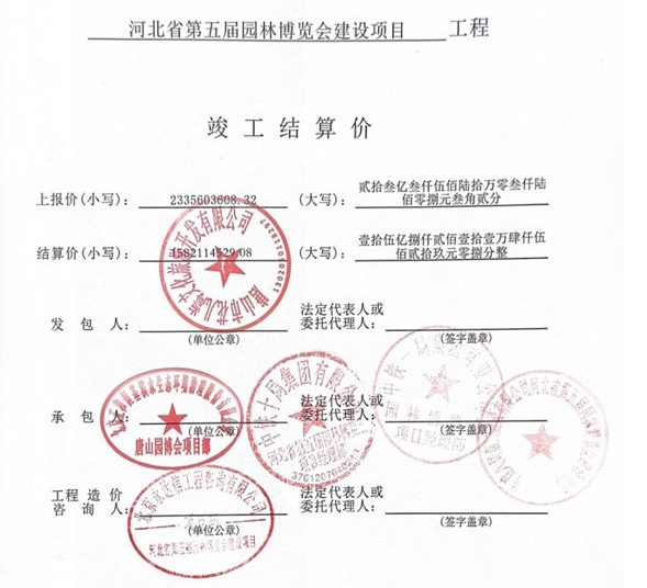 2023年11月23日,河北省第五届园林博览会建设项目竣工结算审定书中明确了审定结算金额为15.8亿元。正和生态市场负责人表示,其中正和生态审定结论为5.23亿元。