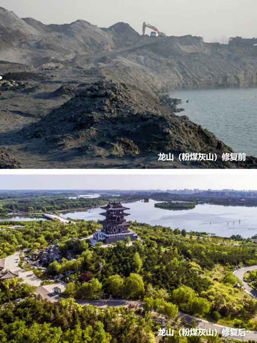 ▼正和生态在2015年南湖建设中粉煤灰山修复前后对比。受访者供图