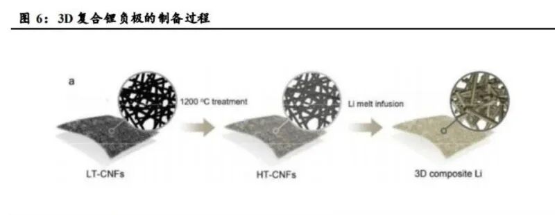 传统锂金属负极是平面或者其他二维结构,在多次锂沉积和剥离过程中体积会有巨大变化,使锂金属负 极的结构发生明显变化。为了解决此问题,将三维骨架作为金属锂的“宿主”以缓解其在循环过程中的体 积膨胀。在充电过程中,三维骨架内部的空间可以用于存储锂沉积以缓解体积膨胀和抑制锂枝晶的垂直 生长。同时,在放电过程中,存储在三维骨架内部的锂开始剥离溶解,而三维骨架则保持稳定以避免发生结构坍塌。在三维骨架引入锂的方式包括熔融灌注和电化学沉积两种方式。然而,三维骨架的引入会 在一定程度上降低负极材料的比容量,因此三维骨架在复合锂负极中的占比是非常重要的。 碳基基底材料:在锂金属电池基底材料中,碳基材料有优异的导电特性、可调控的结构特性及稳定的化 学性质。目前针对不同孔隙结构和形貌特征的碳材料展开了系统性的研究,其中,电化学手段构建石墨 烯/碳纳米管(CNT)的符合界面成为主流。例如,有研究人员在三维碳纳米管(CNT)表面构筑 Al2O3 人工 SEI 膜,开发出新型锂金属沉积电极。该体系通过优化碳源类型和添加剂配比显著提升了电 化学性能,其孔隙结构与高比表面积(300~400m2g-1)展现出的优势,不仅有效促进锂离子的均匀成 核,更实现了对锂枝晶生长的空间约束。实验表明,该复合电极在 80 次沉积/剥离循环后仍保持 92.4% 的库伦效率,相较于铜箔电极具有更高的库伦效率。
