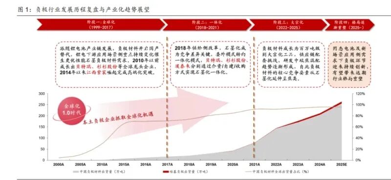 梳理负极材料的发展趋势: (1)1999-2017 年:本土负极企业抓取全球化机遇。上世纪 90 年代,日本索尼公司研发出首款商用 锂电池,初代锂电池负极的石油焦受限于结构及比容量问题而被中间相炭微球(MCMB)材料取代进行 广泛应用,负极材料行业由日本完全垄断。1999 年杉杉股份(维权)寻求新能源转型与鞍山热能研究院合作实现 MCMB 大规模量产,本土负极材料企业开始发力。3C 电池趋势下,开发性能更优的石墨材料以淘汰成 本高且容量较差的 MCMB 材料成为产业主要趋势。2000 年贝特瑞突破天然磷片石墨化技术使得天然石 墨开始国产化,2005 年杉杉股份成功研发出人造石墨负极材料 FSN-1,2012 年江西紫宸成立并与 ATL 达成密切合作,逐步实现高端化突破。1999-2017 年期间,锂电下游应用场景侧重点不断变化,本土企 业贝特瑞、杉杉股份等逐步成长为全球负极龙头,中国负极产量全球占比持续提升。