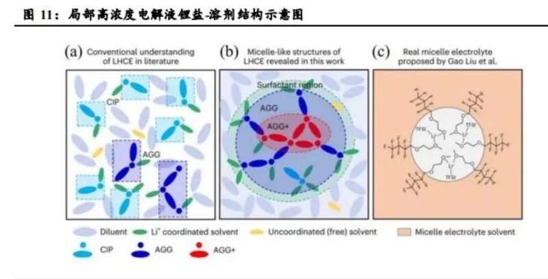 “局部高浓度电解液”的改性策略:当前,商业化的电解液浓度被优化控制在 1M(molL−1)左右。具体 地说,锂盐对电解液体系中的锂离子输运至关重要,并且锂离子电导率随着锂盐浓度的增加而增大。同 时,高浓度的电解液可以有效避免锂金属负极表面由于浓差极化所造成的锂离子含量降低和分布不均匀。 然而,过高的锂盐浓度不仅提高了电解液粘度导致锂离子迁移阻抗上升,而且还会在一定程度上提高了 电解液的生产成本。鉴于高浓度电解液所面临的困境,相关研究人员进一步提出了“局部高浓度电解液” 的改性策略以实现稳定金属锂负极和高效锂/电解液界面。该策略通过在高浓度电解液中引入溶剂稀释 剂来实现局部高浓度电解液,这样不仅能够保留高浓度盐-溶剂簇的局部配位环境,同时也有效降低了 局部高浓度电解液的总锂盐浓度。 电解液的锂盐通常包括六氟磷酸锂(LiPF6)、六氟硼酸锂(LiBF4)、高氯酸锂(LiClO4)、二负草 酸硼酸锂(LiDFOB)以及双三氟甲基磺酰亚胺锂(LiTFSI)及其衍生物等。然而,在局部高浓度电解 液中,锂盐需要对溶剂具备高溶解度和离解常数以避免相分离而对稀释剂的溶解度需要很小或没有溶解 度。传统的锂盐无法满足这些要求,而锂酰亚胺盐被视为理想的选择(如双三氟甲磺酰亚胺锂(LiFSI) 和双氟磺酰亚胺锂(LiTFSI))。同时,在局部高浓度电解液中,所采用的稀释剂也应该具备较低的黏 度和足够的稳定性,如双(2,2,2-三氟乙基)醚(BTFE)和 1,1,2,2-四氟乙基 2,2,3,3-四氟丙基醚(TTE) 等。