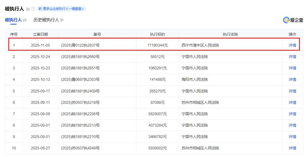 全国工商平台显示,西宁市湟中区人民法院将仕净科技列入“被执行人”,执行号案为(2025)青0122执2837号,执行标的17180344元,立案日期为2025年11月5日。