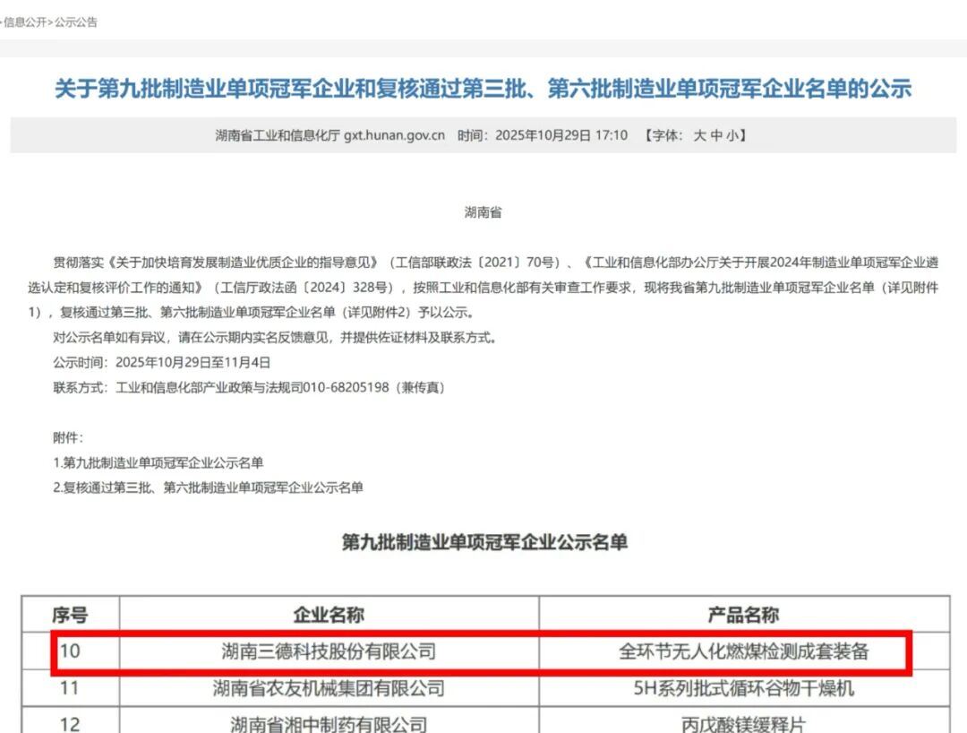 近日,国家“第九批制造业单项冠军企业”名单公示,三德科技凭借核心产品“全环节无人化燃煤检测成套装备”成功入选。