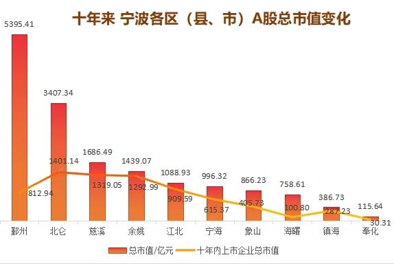 从近十年ⅠPO增量来看,截至目前,余姚、鄞州、北仑分别新增15家、14家、11家居前三;而新增lPO总市值中,北仑、慈溪、余姚、江北十年增量均超千亿元,已赶超鄞州。